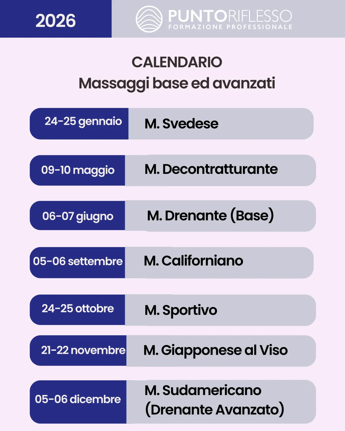 Il percorso proposto da Punto Riflesso è un iter accademico modulare della durata complessiva di circa 2 anni, progettato per formare professionisti completi nel campo delle discipline bionaturali. Il programma è accreditato ASPIN, garantendo standard qualitativi elevati e il riconoscimento del titolo finale di Operatore Olistico in Massaggi Base ed Avanzati.